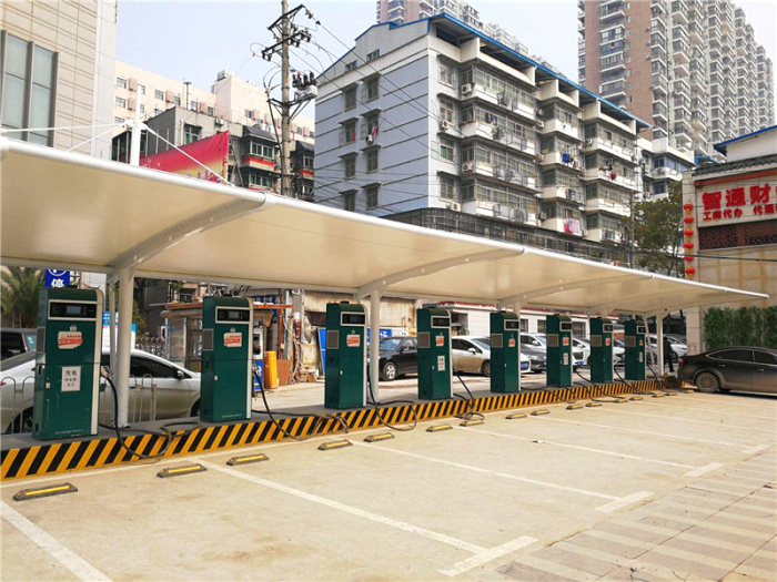 2、空间跨度大—空间跨度大,重量轻,膜结构充电桩绝对保证棚下人和物的安全;