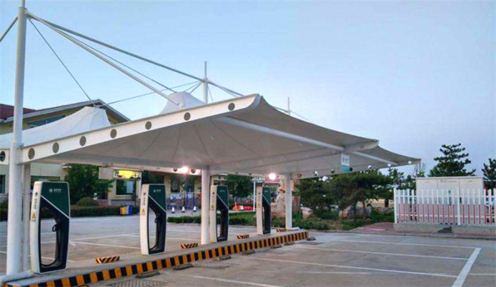 膜结构充电桩具有较好的透光性,其透光率为20%,在阳光暴晒下,使充电桩受到保护。膜结构充电桩表面经过氟素处理,自身不发粘具有很好的自洁性能。膜结构充电桩表面有防紫外线的共挤层,可防止太阳紫外线引起的树脂疲劳变黄现象,且使用寿命长达15-30年。
